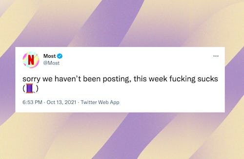 On October 13, Netflix’s LGBTQ+ social channel, @Most, offered words of wisdom in a thread that began: “this week fucking sucks.” @Most is usually the purveyor of memes and promotional material about the Netflix catalog, frequently done in the extremely online, overfamiliar timbre that has become the go-to tone for corporate accounts (On the Black Mirror episode “San Junipero:” “you’re in her DMs. i’m in the afterlife simulation taking her to the club and kissing her in the rain”) It's cutesy and gendered, and its alleged horniness — and, frankly, sense of queerness — is sheathed in an executive-approved sheen.