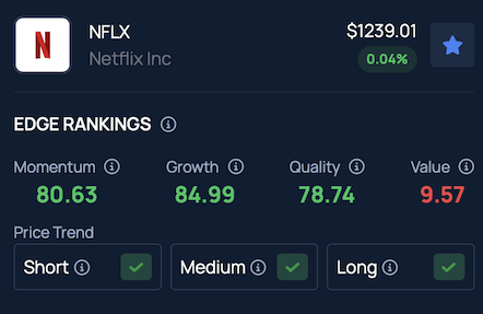 Benzinga's Edge Stock Rankings indicate that NFLX maintains solid price trend across short, medium and long-term periods. More detailed performance insights are available here.