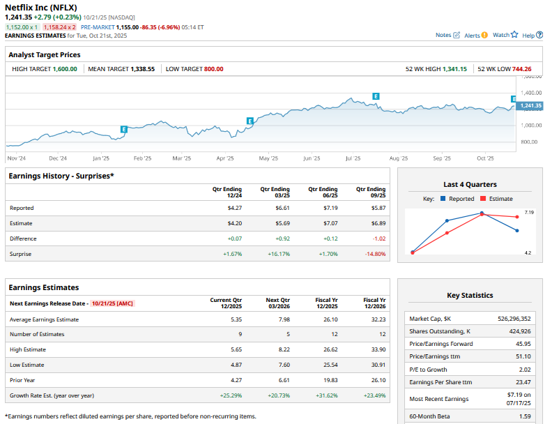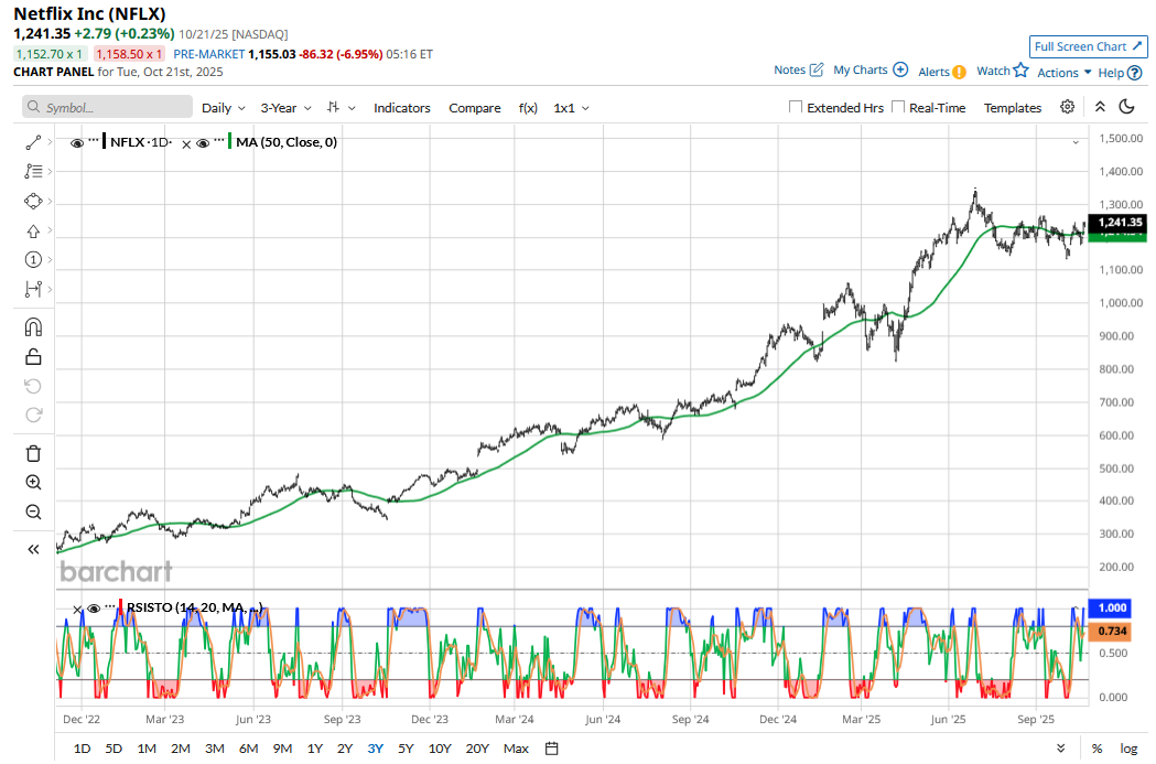 Netflix (NFLX) reported its Q3 2025 earnings yesterday, Oct. 21, after the close of markets. While the streaming giant posted in-line revenues, its profits fell short of expectations. In this article, we’ll discuss why it makes sense to buy the dip in the stock that has looked weak since hitting its record highs late June.