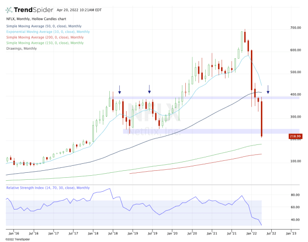 If Netflix stock stays below this area, bulls have to be aware of the potential for it to test down into the $200 level and the 50-quarter moving average (green line). That comes into play near $188.