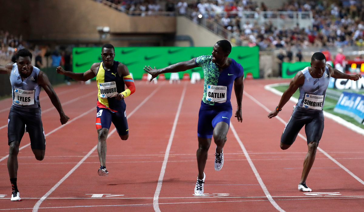 Those fireworks meant that, for once, the men’s 100 metres was not the biggest race of the night – though it was still an excellent one as Justin Gatlin won it in 9.91 seconds, edging fellow Americans Noah Lyles (9.92) and Mike Rodgers (10.01).