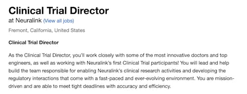 The rest of the job posting is quite unremarkable; essentially Neuralink wants its new trial director to have experience with implantable devices and a working knowledge of how the FDA regulates human studies. Neuralink promises free meals, flexible PTO, and the “opportunity to change the world” in return.
