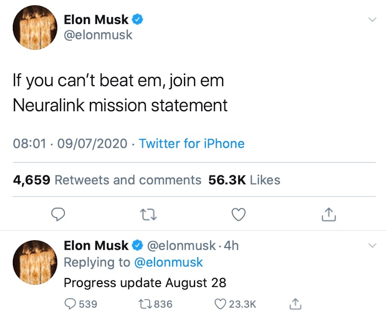 On Musk's Twitter account Thursday, the founder declared that a press update will take place on Friday, August 28. Musk shared the date of the progress update alongside Neuralink's mission statement: "if you can’t beat em, join em." The statement is perhaps a reference to Musk's overall philosophy with Neuralink: if you can't outsmart super-smart artificial intelligence, join with it in a symbiotic relationship.