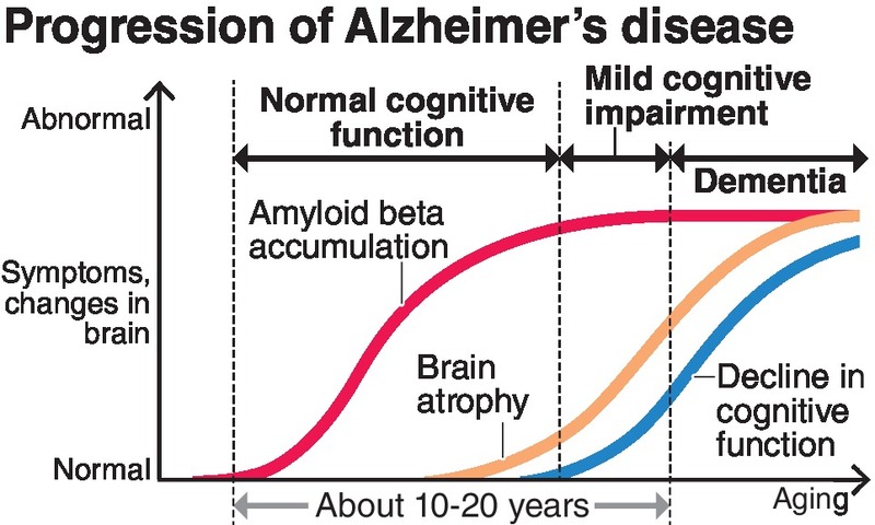 Accumulations of amyloid beta are believed to start forming about 10 years to 20 years before the onset of Alzheimer's symptoms. Nerve cells then become damaged, and the brain atrophies as the disease develops.