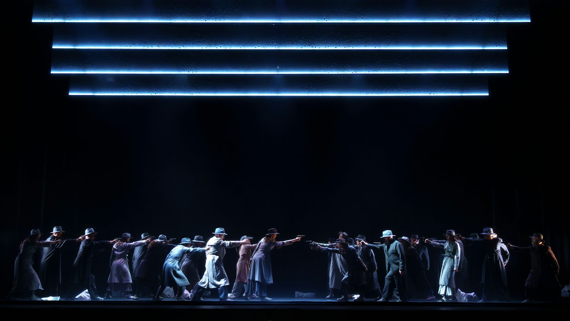 The production begins literally with a bang, as a snap lighting cue reveals the Montagues and Capulets facing each other with guns drawn, dressed in 1940s trench coats and hats.