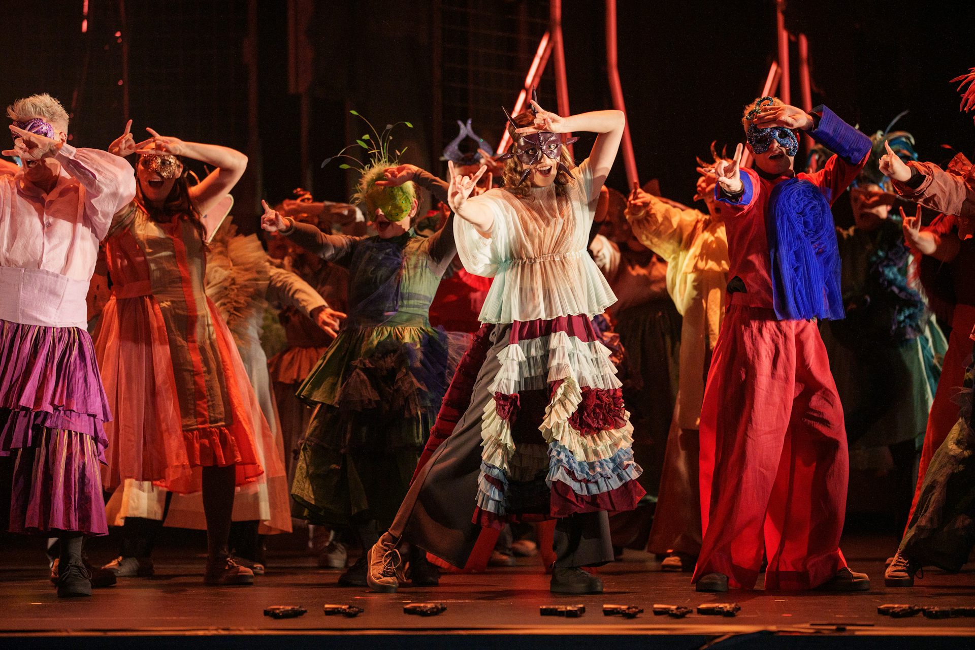 From her training with École Jacques Lecoq, director Rodula Gaitanou is interested in the notion of “suspended space” and how a theatrical space is charged by human rhythm to become a living space. The rhythm here is in the music performed by the Adelaide Symphony Orchestra and accompanying movement and song of the two lead performers echoed by the supporting cast and the State Opera Chorus.