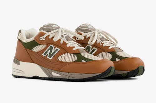 Autumnal shades of burnt orange and olive green dress the other 991, which arrives with a smooth leather upper. Hits of gray suede make an appearance at the tongue and collar to marry the sneaker with its counterpart, while dark green decorates a few leather panels throughout the upper. The shoe’s midsole sticks to cream and gray shades to match the cream mesh above as olive makes its final appearance on the grippy black outsole.