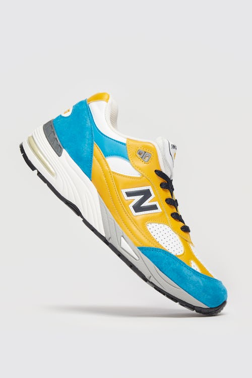 Erik’s pair, on the other hand, has been altered to reflect his original design. A cerulean blue replaces the original counterpart’s mint green color, appearing at the toe, heel, and ankle in leather and suede. Yellow leather overlays cover a white base, with the shade also hitting the heel and tongue branding.