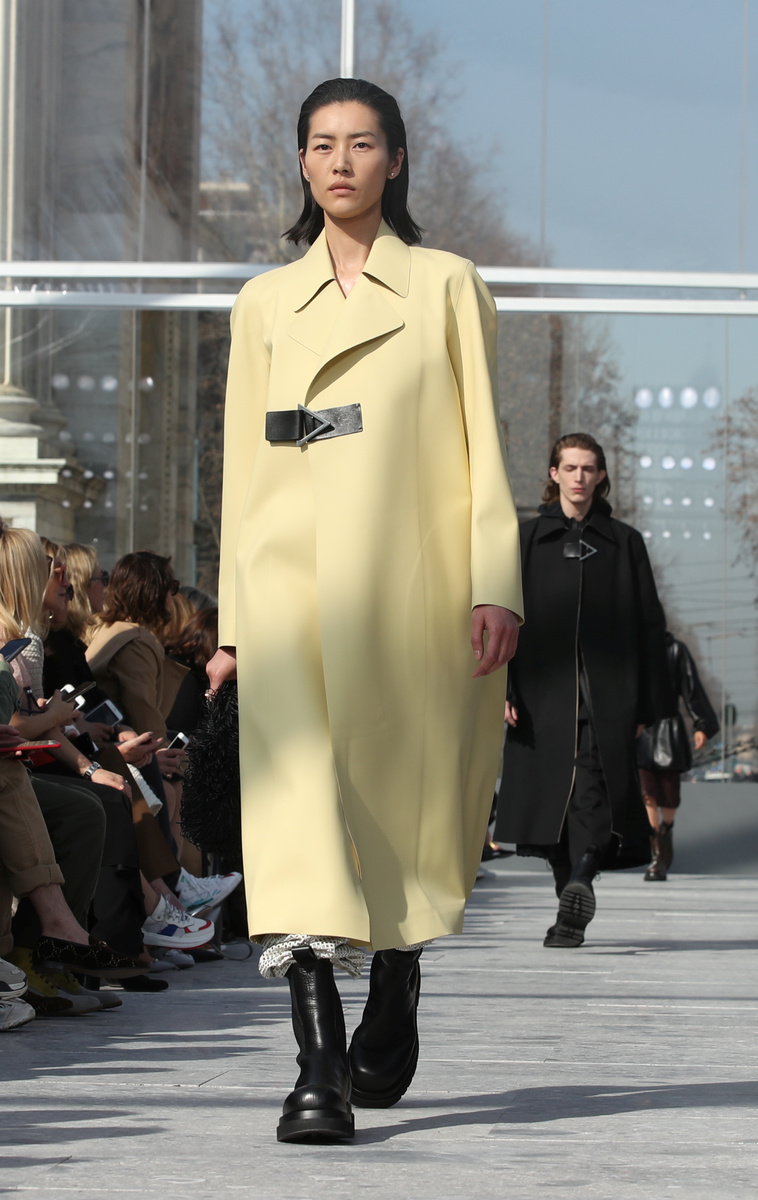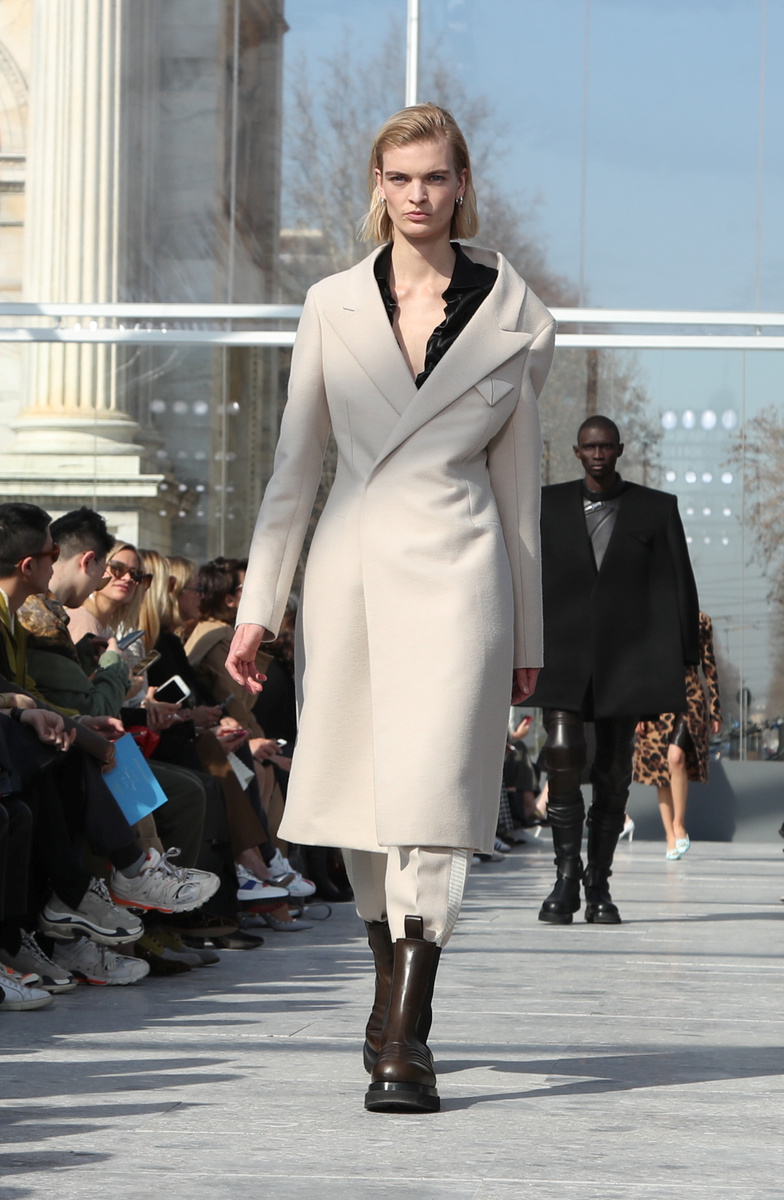 For men, there were knits, sometimes ribbed or with rolled up necks, deconstructed or slit, and with extra long sleeves. Tailored coats were sleek and worn over sheer-like tops. Trousers were tucked into chunky boots.