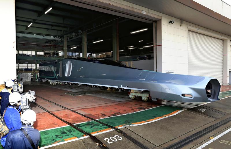 A test car of a new Shinkansen bullet train model featuring a longer nose to reduce noise when entering tunnels is unveiled Wednesday at Kawasaki Heavy Industries, Ltd.'s factory in Hyogo Ward, Kobe. The new car is designed for the Tohoku and Hokkaido Shinkansen lines. Its nose is about 16 meters long, a meter longer than the current model. East Japan Railway Co. plans to start test runs in May toward a commercial debut around 2030 at a maximum speed of 360 kph.