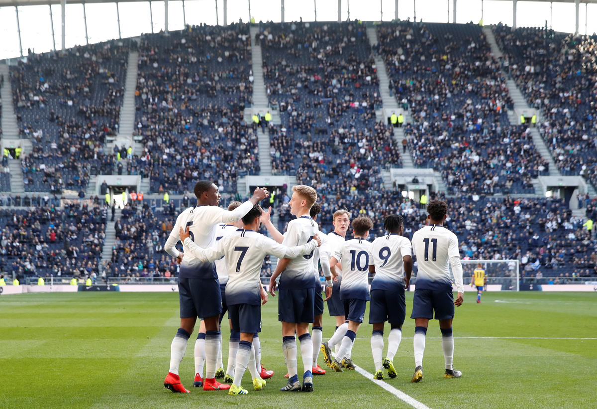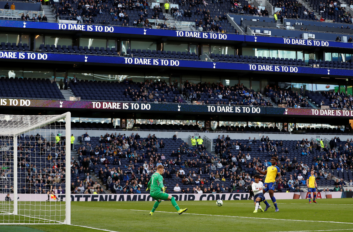Soccer Football - Tottenham Hotspur Stadium Test Event - Under 18 Premier League - Tottenham Hotspur v Southampton - Tottenham Hotspur Stadium, London, Britain - March 24, 2019 General view outside the stadium before the match Action Images via Reuters/Paul ChildsSoccer Football - Tottenham Hotspur Stadium Test Event - Under 18 Premier League - Tottenham Hotspur v Southampton - Tottenham Hotspur Stadium, London, Britain - March 24, 2019 Fans inside the stadium before the match REUTERS/David KleinSoccer Football - Tottenham Hotspur Stadium Test Event - Under 18 Premier League - Tottenham Hotspur v Southampton - Tottenham Hotspur Stadium, London, Britain - March 24, 2019 Tottenham Hotspur's Harvey White celebrates scoring their second goal with team mates REUTERS/David KleinSoccer Football - Tottenham Hotspur Stadium Test Event - Under 18 Premier League - Tottenham Hotspur v Southampton - Tottenham Hotspur Stadium, London, Britain - March 24, 2019 General view inside the stadium during the match REUTERS/David KleinSoccer Football - Tottenham Hotspur Stadium Test Event - Under 18 Premier League - Tottenham Hotspur v Southampton - Tottenham Hotspur Stadium, London, Britain - March 24, 2019 Tottenham manager Mauricio Pochettino during the match Action Images via Reuters/Paul ChildsSoccer Football - Tottenham Hotspur Stadium Test Event - Under 18 Premier League - Tottenham Hotspur v Southampton - Tottenham Hotspur Stadium, London, Britain - March 24, 2019 General view during the match REUTERS/David Klein Soccer Football - Tottenham Hotspur Stadium Test Event - Under 18 Premier League - Tottenham Hotspur v Southampton - Tottenham Hotspur Stadium, London, Britain - March 24, 2019 Tottenham Hotspur's Dilan Markanday scores their third goal Action Images via Reuters/Paul Childs