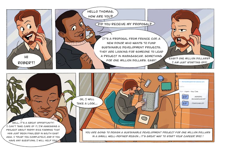 The comic book starts with a description of the issues surrounding a rural development program in a small, 4,400-acre farming area near Itasy. A farmer, a volunteer, a senior international expert and a researcher take turns to pitch farming projects to Thomas, who, with the help of the reader, must decide which one is best suited to the region.