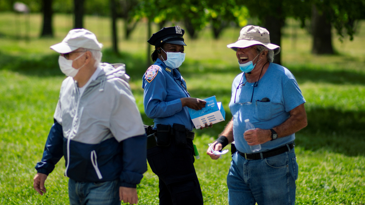 A New York Police Department officer keeps an eye on people as they control social distance on a warm day during the outbreak of the coronavirus disease (COVID-19) at Domino Park in Brooklyn, New York, U.S., May 16, 2020. REUTERS/Eduardo Munoz