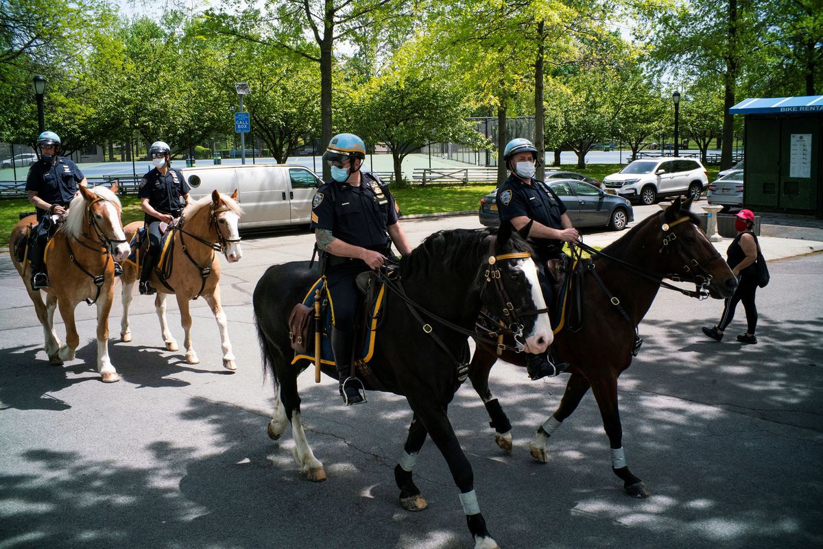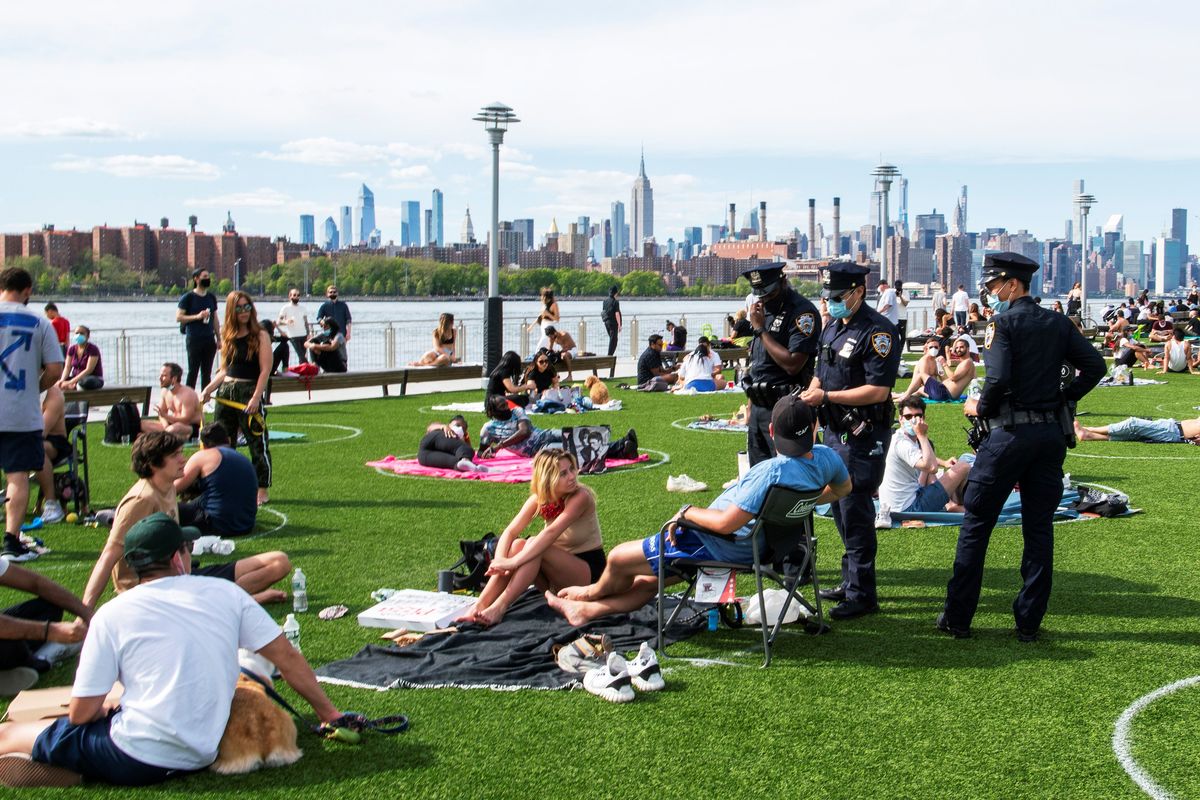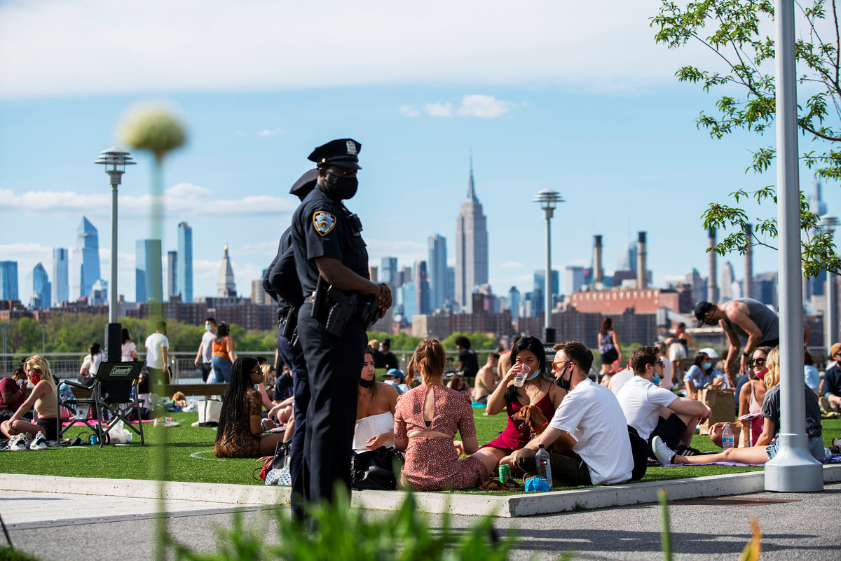 New York Police Department officers keep an eye on people as they control social distance on a warm day during the outbreak of the coronavirus disease (COVID-19) at Domino Park in Brooklyn, New York, U.S., May 16, 2020. REUTERS/Eduardo Munoz