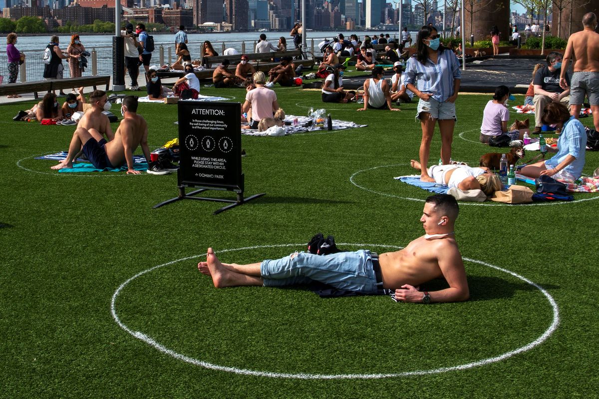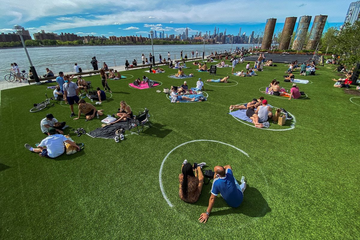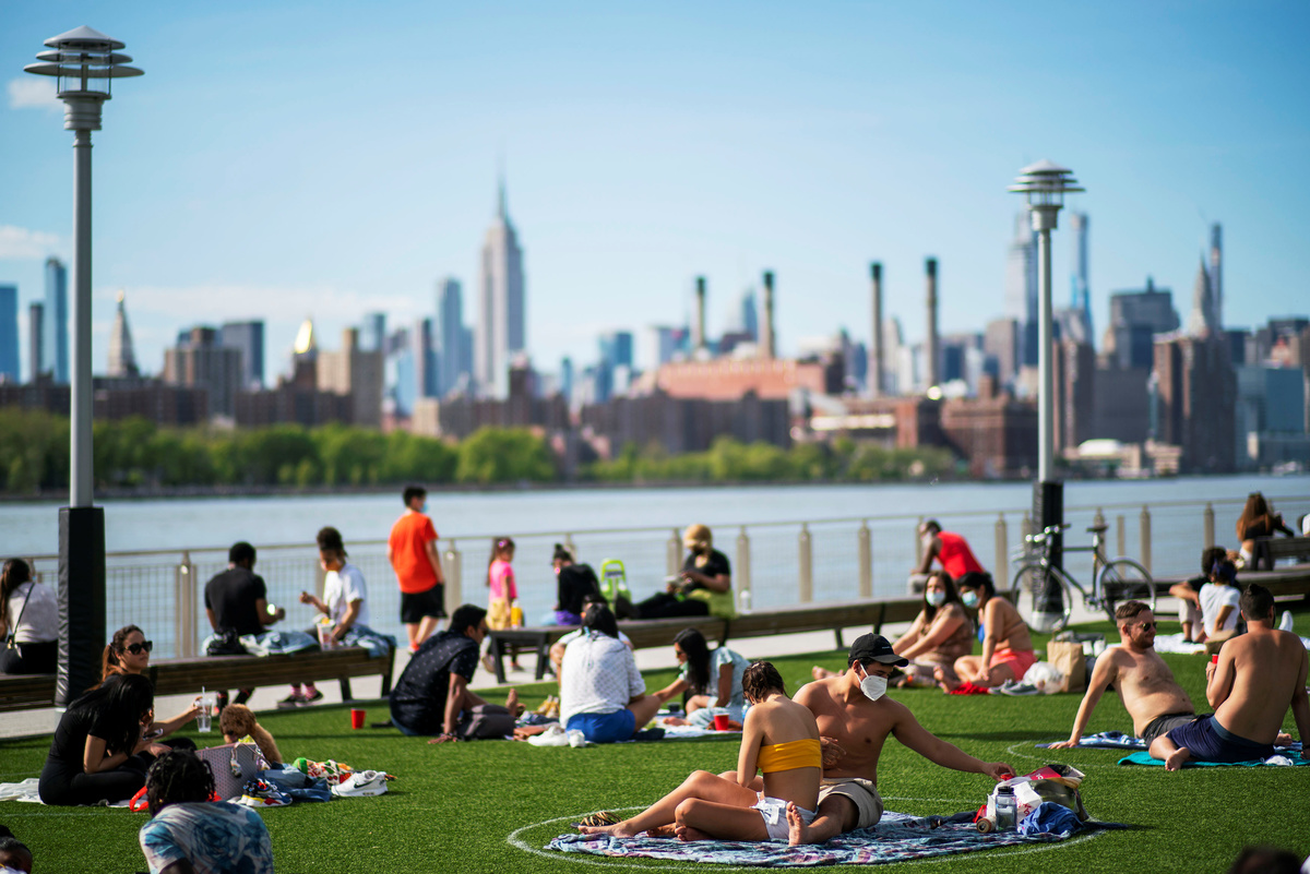 People try to keep social distance as they enjoy a warm afternoon during the outbreak of the coronavirus disease (COVID-19) at Domino Park in Brooklyn, New York, U.S., May 16, 2020. REUTERS/Eduardo Munoz
