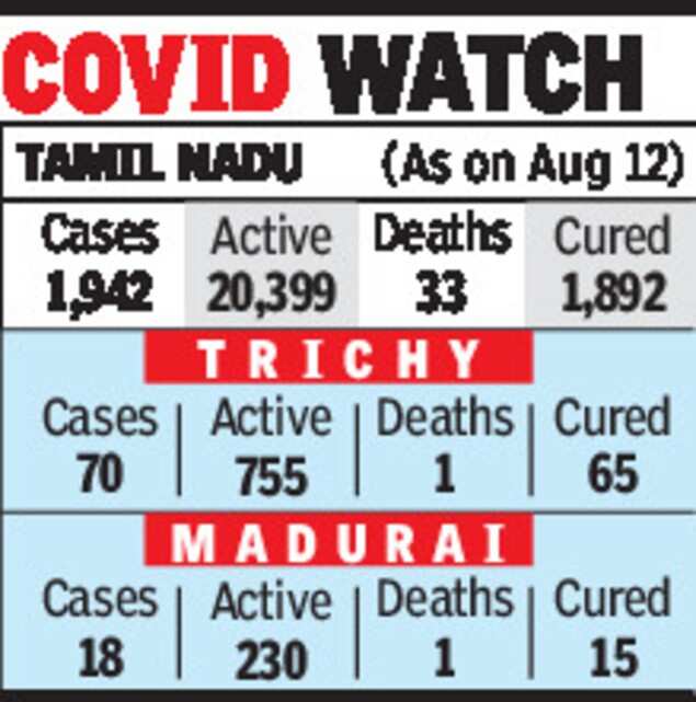 MADURAI: The number of fresh Covid-19 cases added in Madurai outnumbered recoveries on Thursday, resulting in a marginal rise in the number of active cases to 230. The district added 18 fresh cases against 15 recoveries. It was no different in Trichy too as the district recorded 70 new cases against 65 recoveries and 755 active cases. Both the districts recorded one death each.