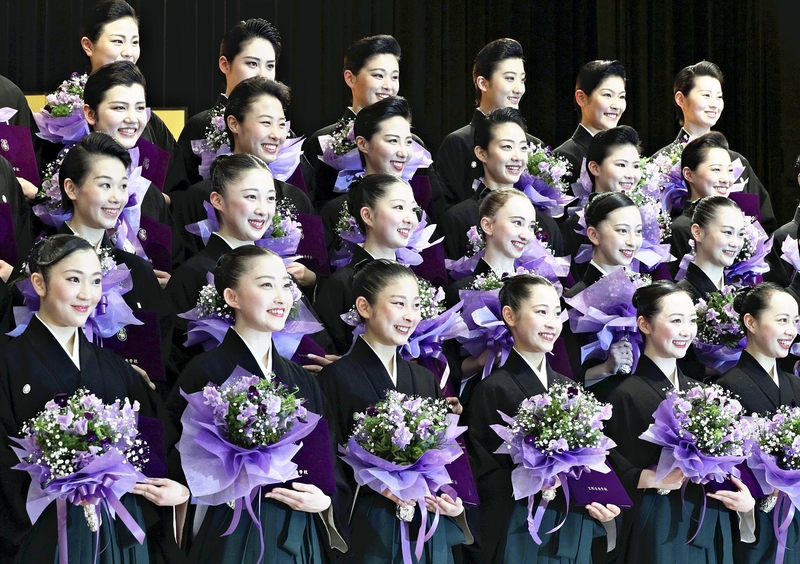 Forty graduates of the Takarazuka Music School in Takarazuka, Hyogo Prefecture, hold flowers as they pose for photos at their graduation ceremony on Friday. The principal presented diplomas to each of the young women, all clad in traditional black crested montsuki kimono and green hakama trousers. After two years of training, mainly in acting, dancing and singing, they will make their stage debuts as "Takarasiennes," as members of the all-female Takarazuka Revue are known, in mid-April.