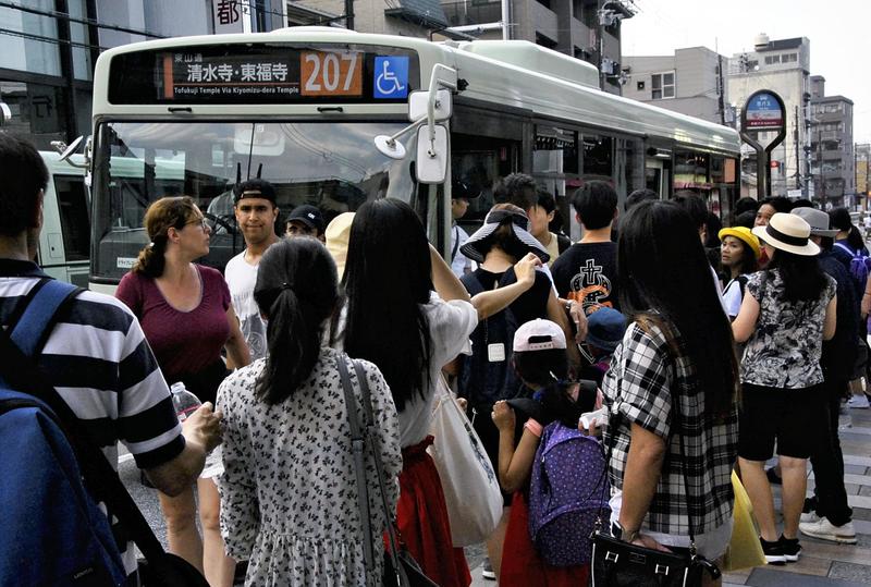"Another bus bound for JR Kyoto Station will arrive shortly," announced a bus driver at a bus stop near Kiyomizu-dera Temple, one of Kyoto's most popular tourist sites. The doors closed as the bus drove off packed with passengers.