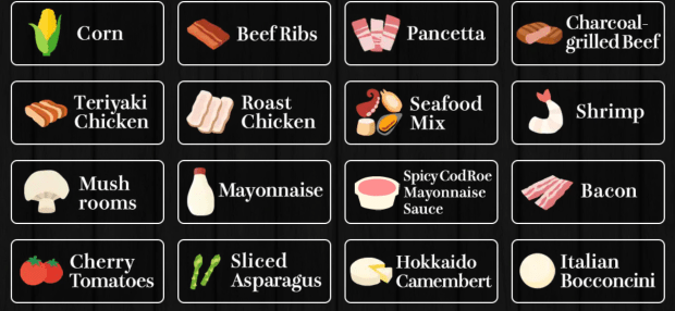 The toppings range from the obvious (tomato sauce, pepperoni, basil) to the interesting (Hokkaido camembert, seafood mix, potato) and are all piled onto a single pie.
