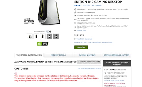 If you’re in California and try to buy this Alienware gaming PC from Dell, your order will be canceled. That goes for several other states as well, which have imposed new regulations on power consumption that affect more power-hungry consumer electronics.