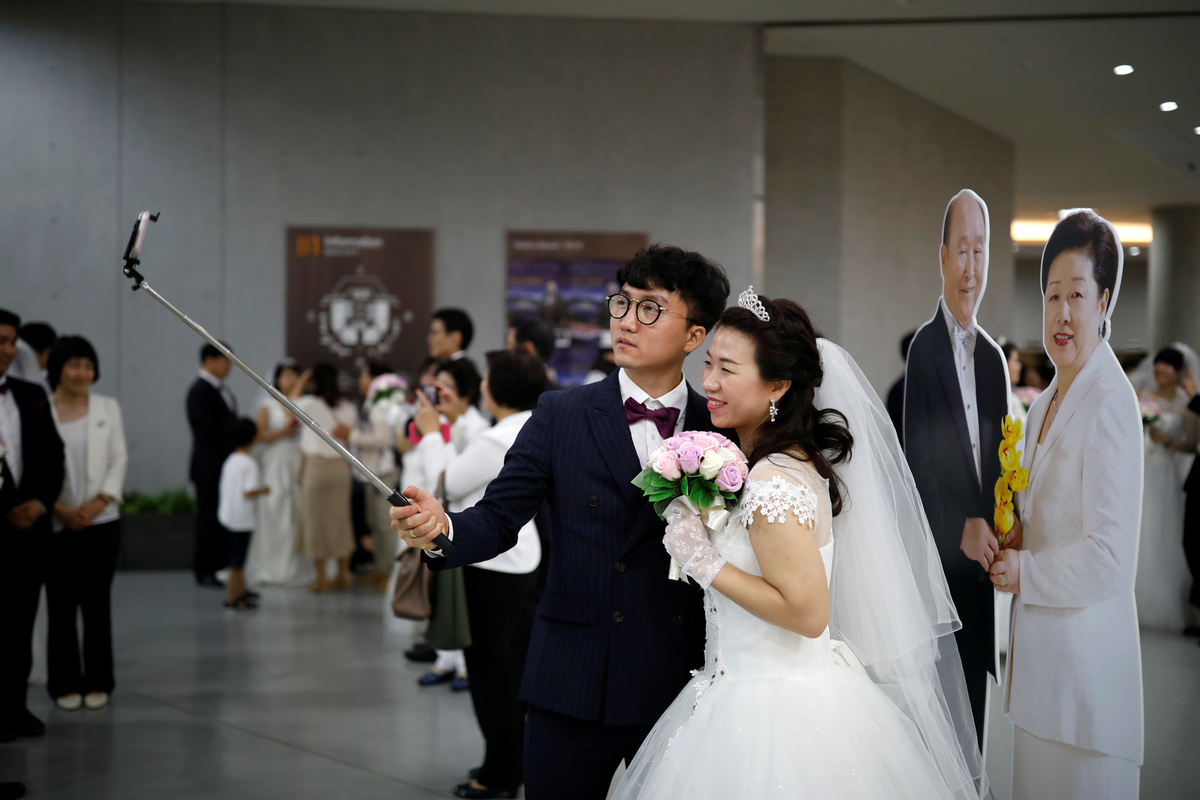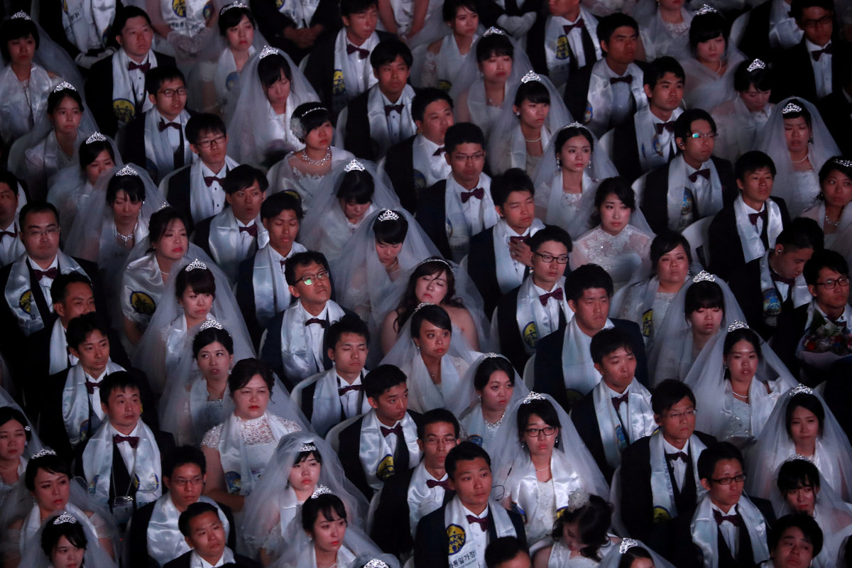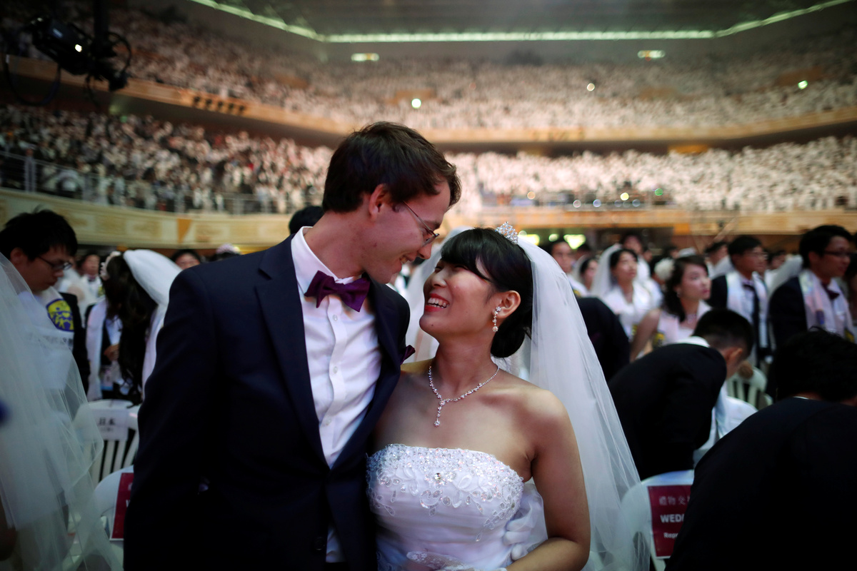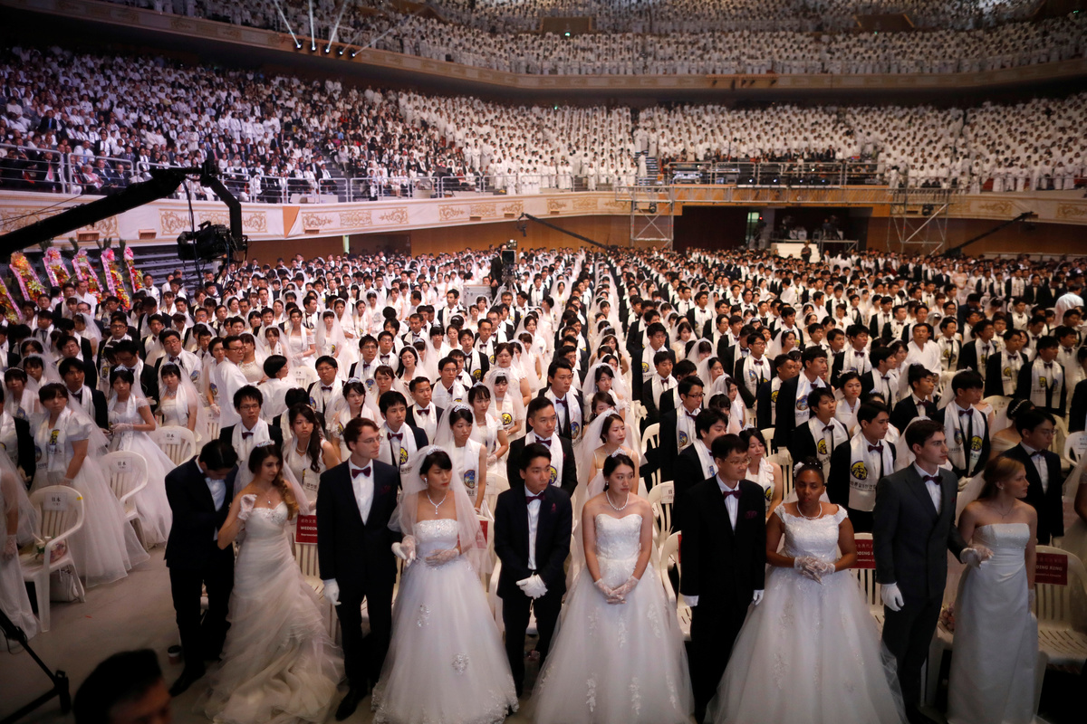 On Monday, about 1,000 couples were married at a ceremony in Gapyeong, northeast of Seoul, while another 3,000 couples renewed vows. In all, 64 nationalities were represented.