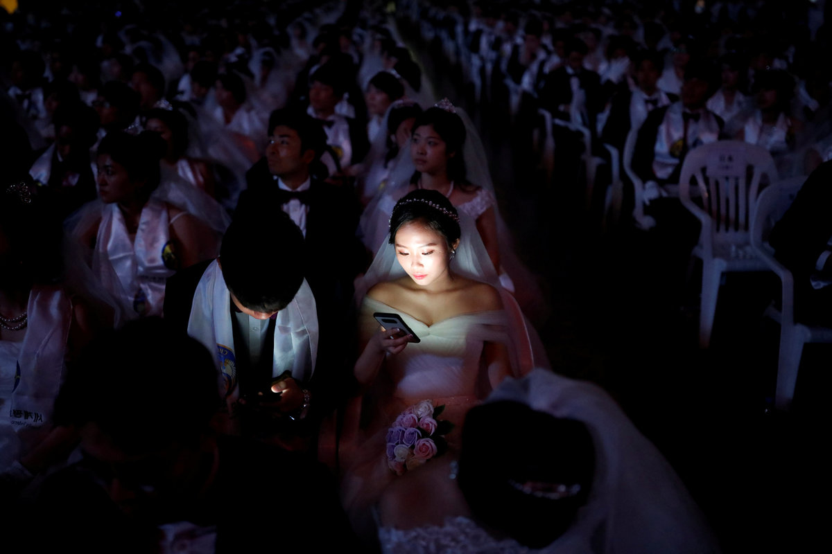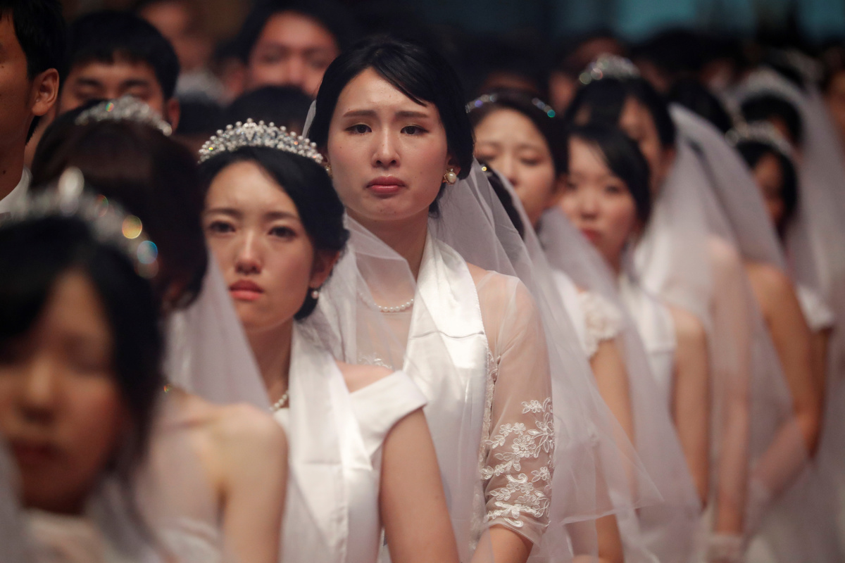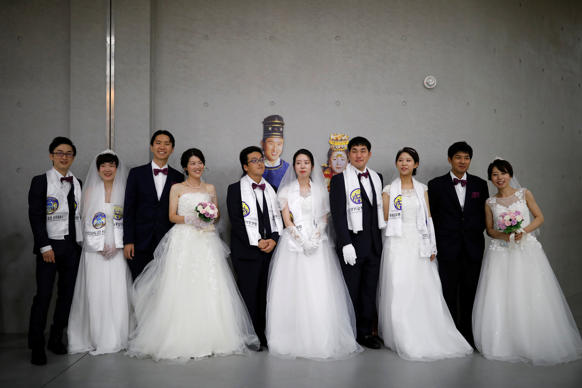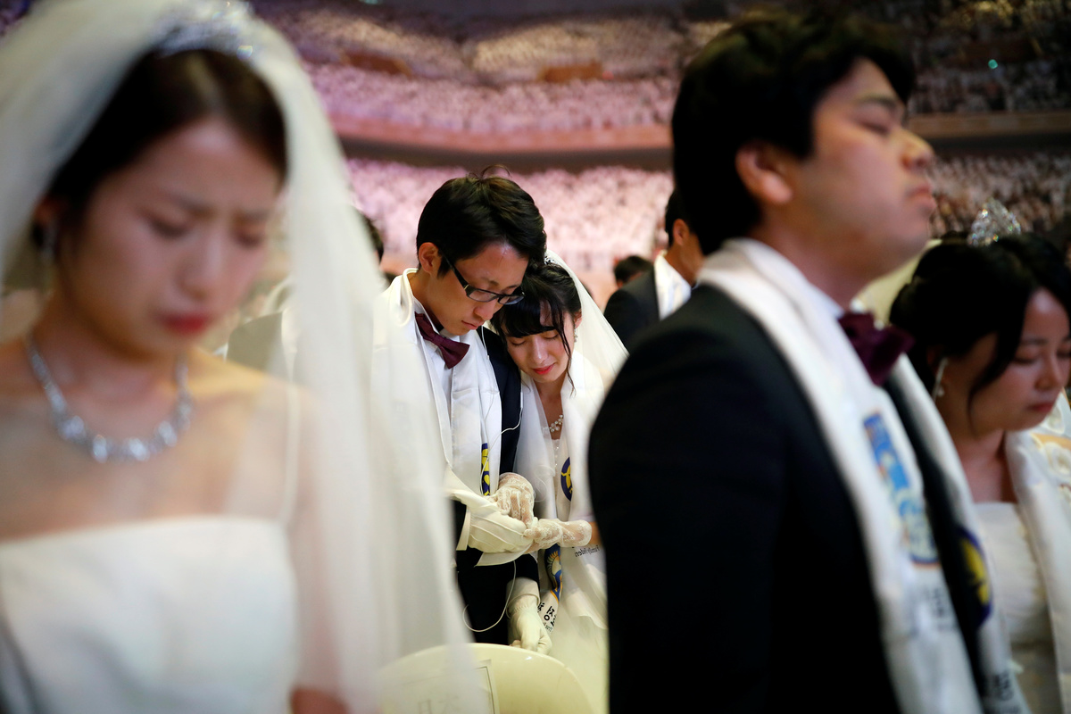 On Monday, about 1,000 couples were married at a ceremony in Gapyeong, northeast of Seoul, while another 3,000 couples renewed vows. In all, 64 nationalities were represented.