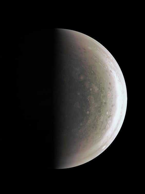 All eight of Juno’s science instruments were collecting data. The Jovian Infrared Auroral Mapper (JIRAM), supplied by the Italian Space Agency, acquired images of Jupiter at its north and south polar regions in infrared wavelengths.
