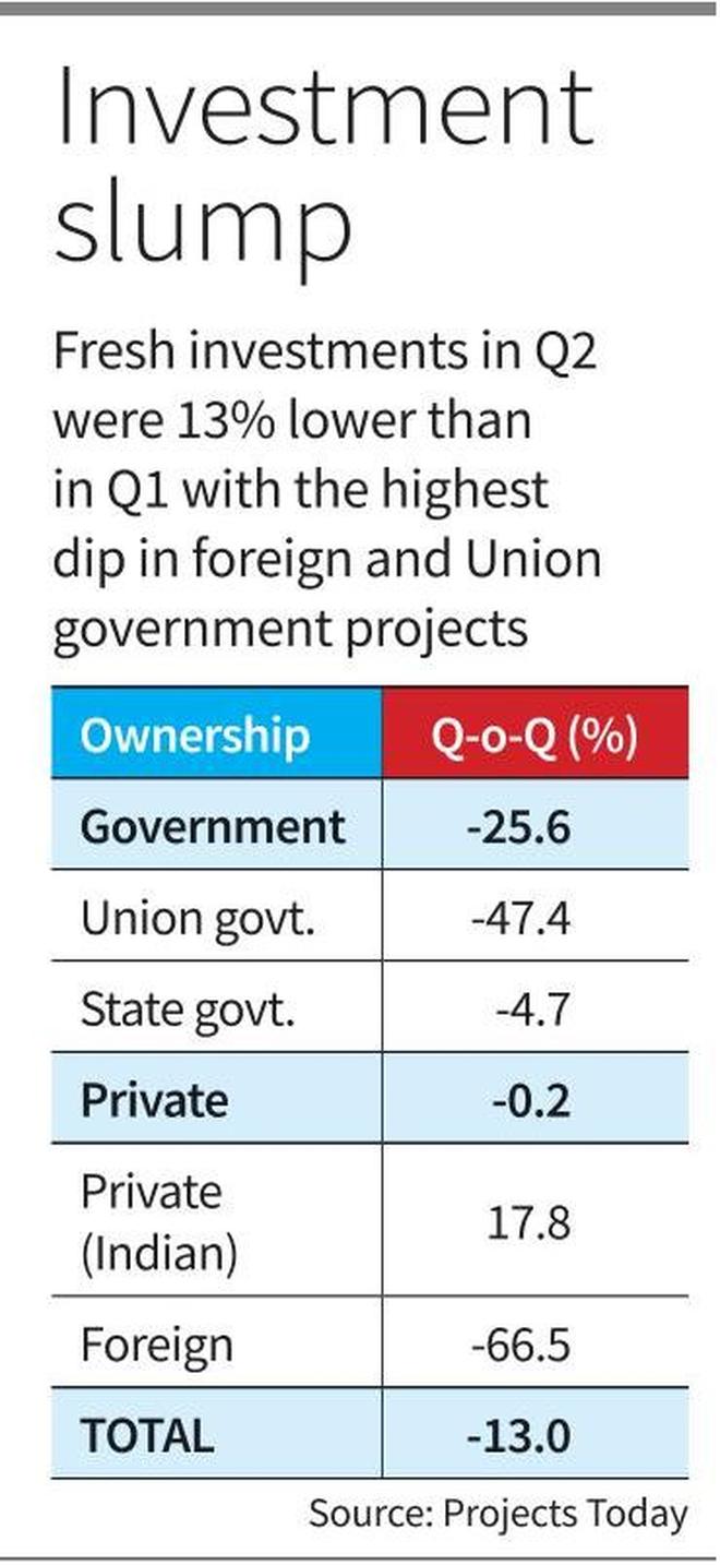 Fresh investment announcements in the July-to-September quarter, the second quarter of 2023-24, have dropped to ₹6.9 lakh crore, 13% lower than the first quarter, and 21.5% down from a year ago, driven by a sharp dip in proposed outlays by the Union government and foreign investors, and a broad-based contraction across the manufacturing, mining, infrastructure, and electricity sectors.