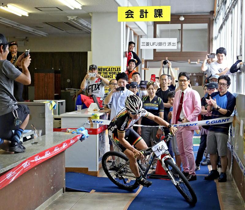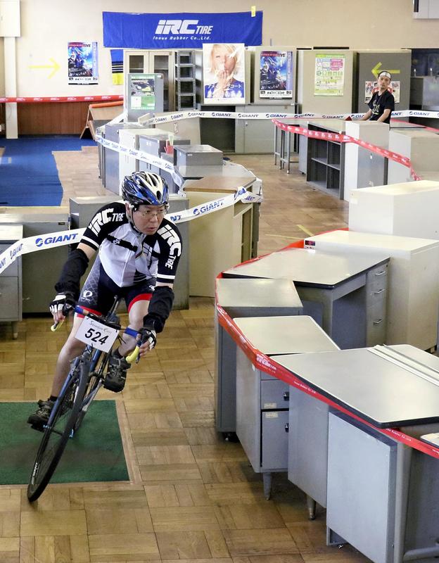 About 100 bicycle lovers gathered from across the nation, from Hokkaido, Fukushima, Kumamoto and other prefectures. One by one, at 1-minute intervals, the cyclists started the race from the reception area of the former taxation department. The racers pedaled through a course set off by desks, steel shelves and other office equipment in the rooms where city hall staff used to work, then passed a narrow door of the revenue officer's room where a notice was still posted saying a meeting was taking place. Finally, they came out of the building through the front entrance before dashing for the finish line set in the parking lot. The rare time trial course was about 200 meters long. Riding on mountain, cyclo-cross and other sports bikes, it took less than 35 seconds for advanced riders to finish.