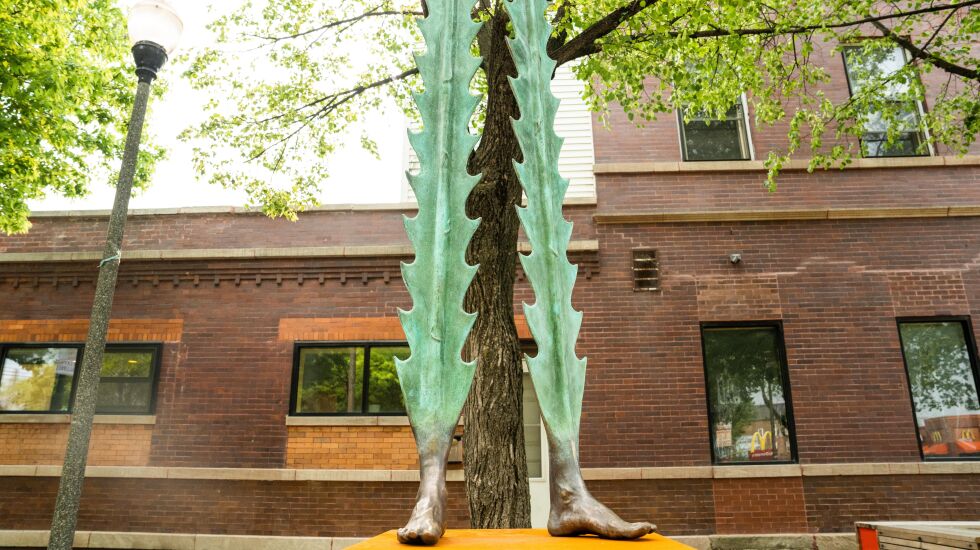A wayfaring sculpture, 9-feet tall with shining bronze feet that give way to a nopal-green, cactus-shaped body, landed in Little Village on Friday.