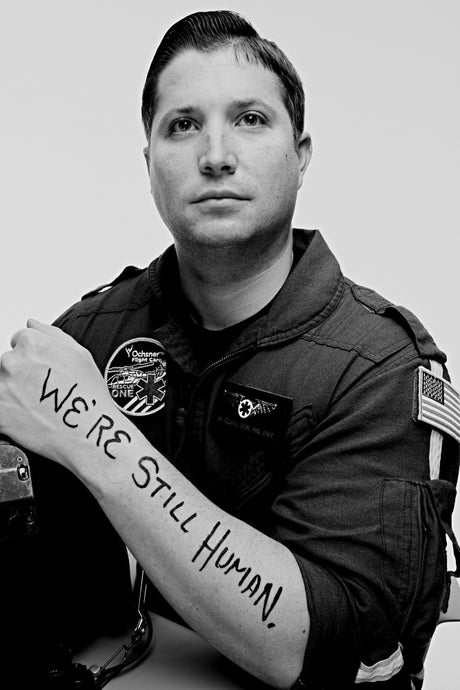Does he have a favorite among the portraits and stories? Coaxed to single one out, Fogarty talks about the nurse whose compassion was rooted in words she heard as a troubled girl of 16. In the portrait, the words are emblazoned on her throat and chest as she smiles at the camera. They are the words that, perhaps, saved her life when she called a suicide hotline and heard the woman on the other end of the line say: “I AM HERE FOR YOU.”
