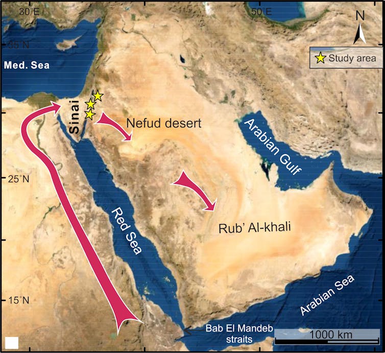 Researchers hypothesise humans migrating out of Africa would have used platforms in the eastern Sahara, the Nile River Valley, or the margins of the western Red Sea.