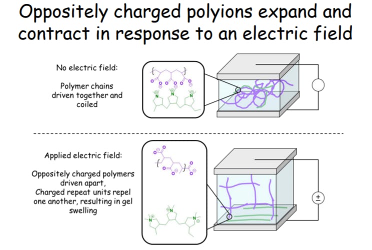 Abstract: Development for refreshable braille devices has recently shifted to electroactive polymers (EAP). This paradigm benefits from greater precision, smaller size, and lower cost associated with modern electronics, opening the door for higher resolution and less expensive devices. Displays with resolution finer than required to display braille characters will enable representation of non-text information such as figures, tables, or diagrams. However, adoption of EAPs for responsive displays has encountered problems such as high required field strength (kV/cm), insufficient pressure (2 kPa generated), and poor durability. This work presents a new type of electroactive polymers, based on poly ionic complexes. In contrast to previously reported electroactive polymers, these gels do not rely on a solvent bath, respond to a field that is on the order of V/cm, and expand in a direction parallel to the applied electric field. Ultimately, the expansion is driven by electrostatic interactions: The polyionic gels are overall charge neutral, however, when an electric field of sufficient strength is applied, the ionic bonds are broken and the polycation is drawn towards the plate. This reveals the charged backbone of both the polyanions and the polycations, which causes the repeat units to repel one another and the gel to expand. This mechanism is confirmed using cyclic voltammetry and impedance spectroscopy. With the understanding of the mechanism, the gels are made to expand rapidly and tolerate 100s of cycles. These properties are controlled through the identity of the ionic repeat units and further tuning the crosslinking and processing of the gels. The ionic crosslinks within the gel impart desirable qualities such as self-healing and high toughness a through a cooperative effect, yielding durable gels that are the much stronger than their component parts.The low power requirements and resilient nature of these EAPs make them attractive for use as refreshable braille displays. This methodology could be adapted to other actuators such as soft robotic joints or grippers.