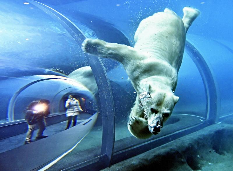 The zoo has expanded the exhibition space for the animals by creating a 430-ton swimming pool that is 20 times bigger than the previous facility. The pedestrian tunnel runs through the pool.