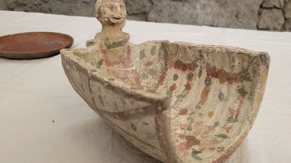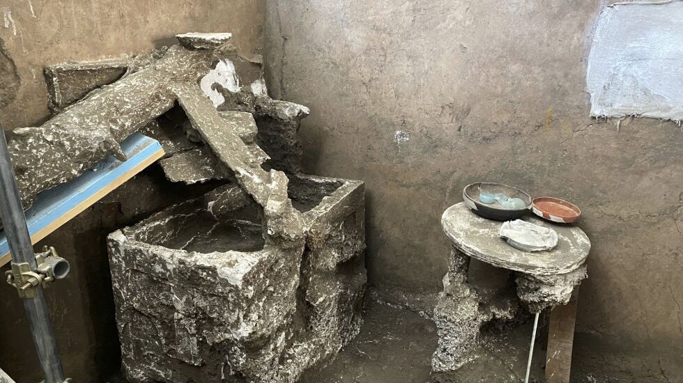 The finds unveiled on Saturday include furnishings and household objects in the domus, which was dubbed the House of the Larario for an area of a home devoted to domestic spirits known as lares. The home unearthed in 2018 has one in the courtyard.