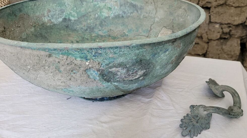 The bedroom findings announced Saturday also included the remains of a wooden trunk with an open lid. Although the weight of beams and ceiling panels that crashed down in the wake of the volcanic explosion heavily damaged the trunk, among the objects found inside was an oil lamp decorated with a bas relief depicting the ancient Greek deity Zeus being transformed into an eagle. Nearby was a small, three-legged round table, similar to the accent tables in vogue today.