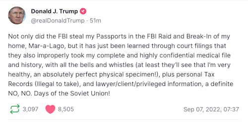 Unsurprisingly, Trump’s immediate reaction to the Post’s allegation arrived a) on his financially precarious Truth Social platform in the form of a b) characteristically self-aggrandizing/pitying bout of dubiously punctuated logorrhea.