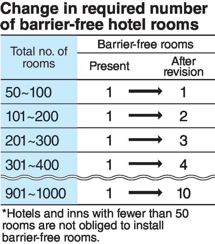 The ordinance sets quantitative criteria that must be met for rooms at hotels and inns to be labeled barrier-free. For example, doors to a room, toilet or bathroom must be "at least 80 centimeters wide and have no steps."