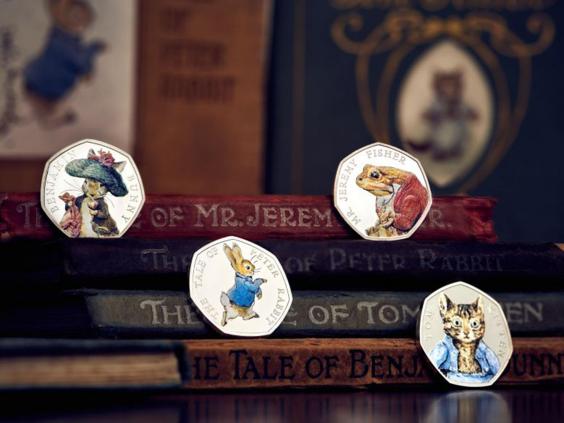 The coins have colour on Peter’s blue jacket, Benjamin Bunny’s green hat, Tom Kitten’s blue pyjamas and Jeremy Fisher’s red coat.