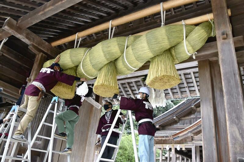 A subsidiary shrine relocation committee made up of shrine parishioners tasked the Suga shimenawa preservation association in Unnan, Shimane Prefecture, to carry out the work. Association members used stepladders and other equipment to attach the 400-kilogram rope to a position about three meters high.