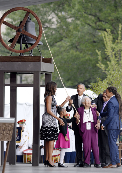 A statue of Thomas Jefferson standing in front of a stack of bricks with the names of his slaves is displayed next to the exhibition on how slaves fought on the front lines of the American Revolution. The floor ends with emancipation in 1863, leading visitors to the "Era of Segregation," where they'll encounter a stool from the 1960 Greensboro, N.C., Woolworth lunch counter sit-ins; the green and violet, floral-leaf patterned dress that Rosa Parks was sewing the day she was arrested for refusing to move to the back of a bus in Montgomery, Ala.; and dozens of relics from the then-budding Civil Rights Movement.