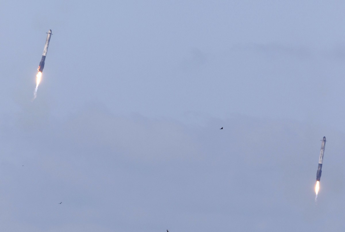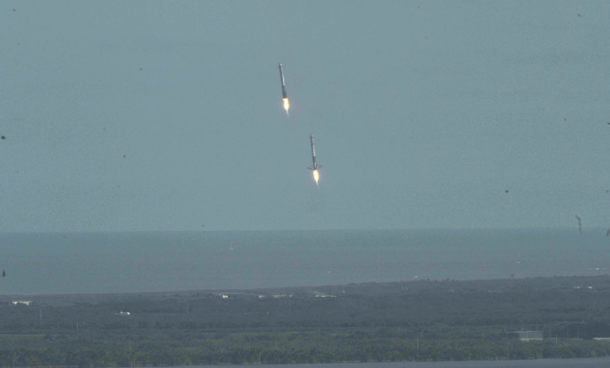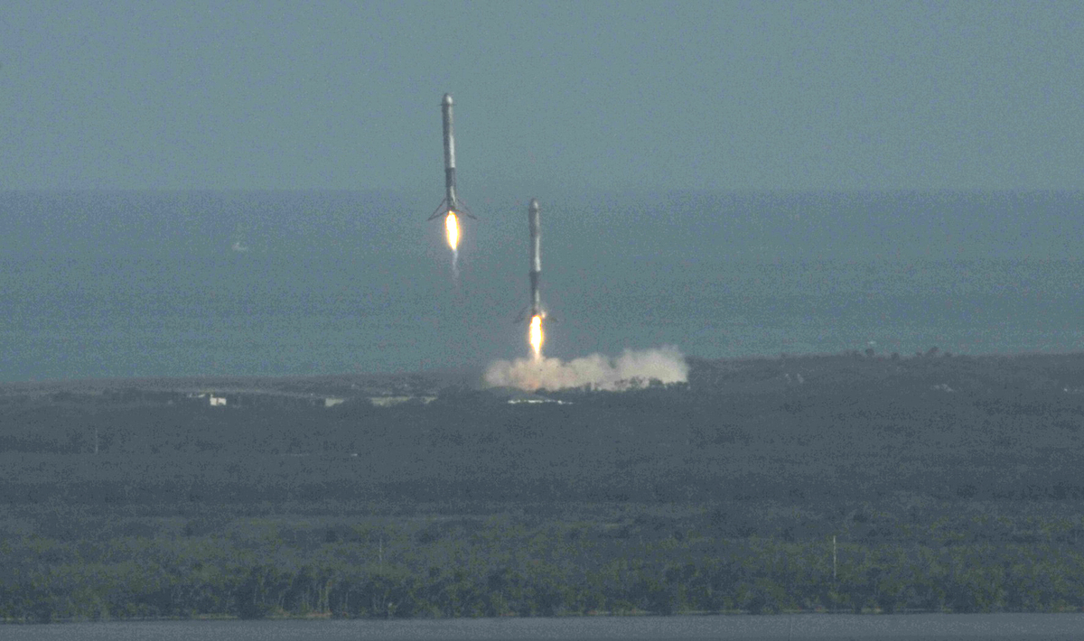 Then, capitalizing on cost-cutting reusable rocket technology pioneered by SpaceX, the two boosters flew themselves back to Earth for safe simultaneous touchdowns on twin landing pads at Cape Canaveral Air Force Station, about eight minutes after launch. Each rocket unleashed a double sonic boom as it neared the landing zone.