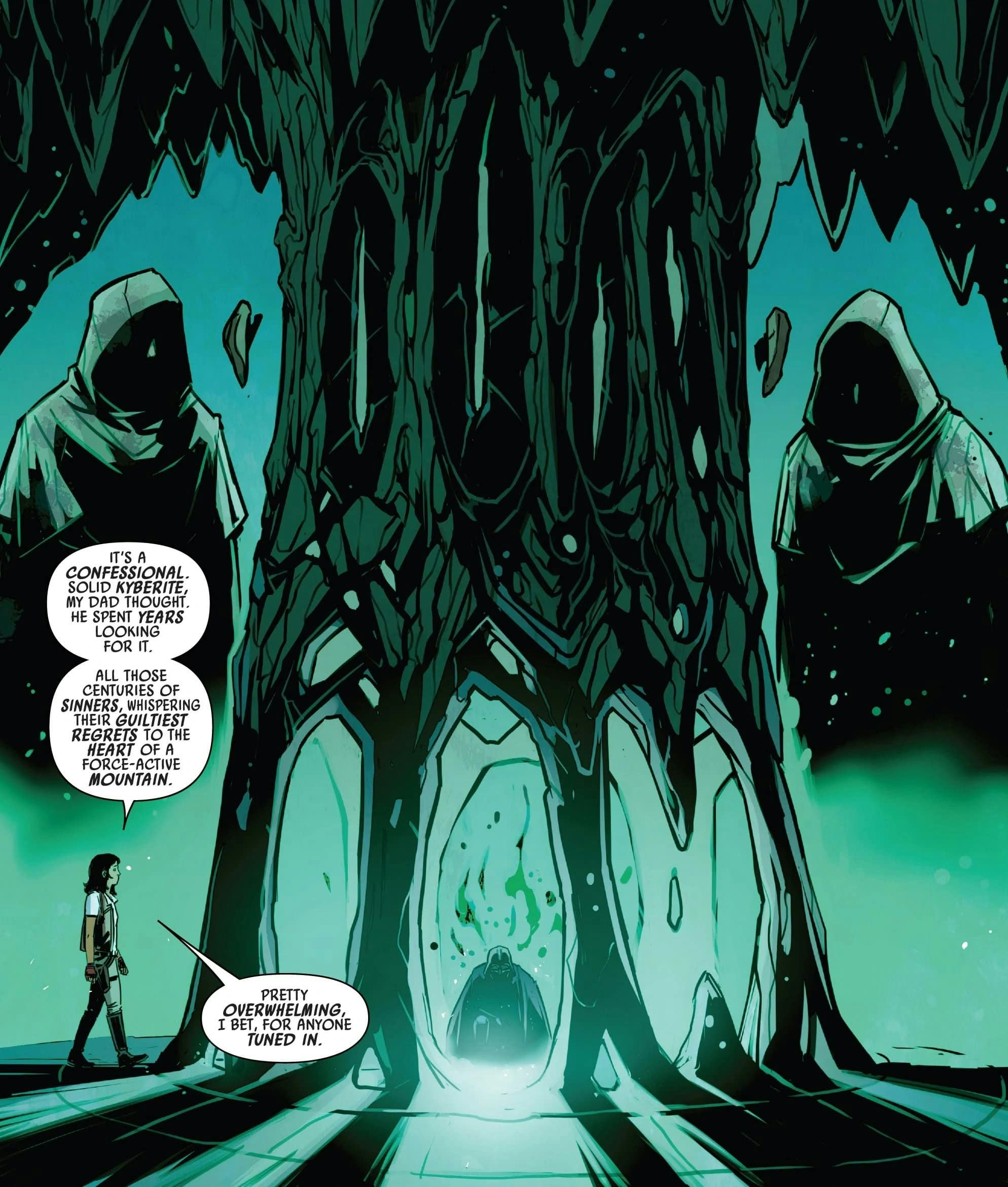 Amid this inner journey Dr. Aphra encounters Miril, a long-dead member of the Ascendant, a cult obsessed with the Spark Eternal. The Spark Eternal could potentially grant Force-like powers to whoever encountered it, but it was sealed in a tomb until Dr. Aphra unearthed it. It then possessed her, giving her the ability to literally dive into her memories.