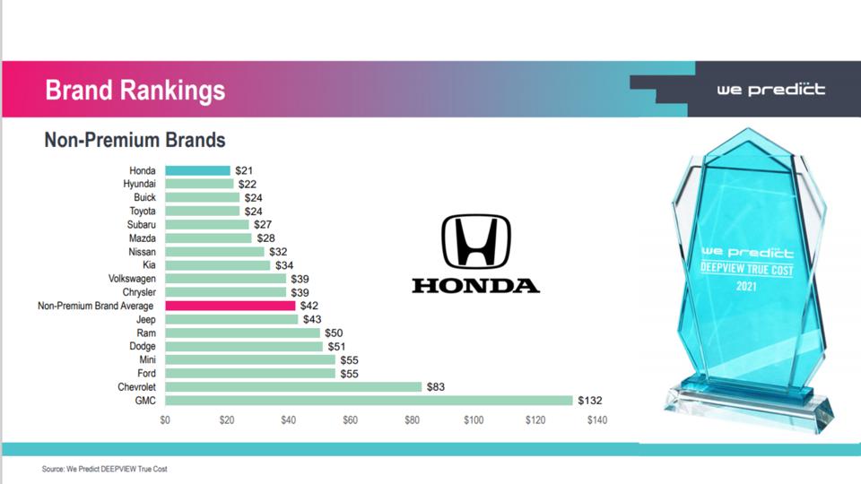 Among non-premium brands Honda topped the list with an average of $21 for service and warranty costs over the three month period for owners and automakers. The average for non-premium brands was $42. At the bottom was General Motors