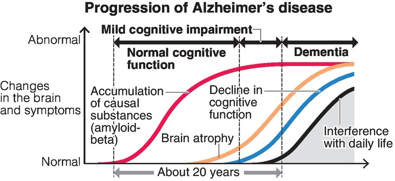 Alzheimer's is asymptomatic, but as amyloid-beta gradually accumulates, the disease progresses to mild cognitive impairment followed by the appearance of symptoms.