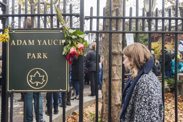 Over the weekend, children put flowers and heart-shaped decals on the jungle gym at the small park named for Adam Yauch, the musician who founded the Beastie Boys and who died of cancer in 2012. By Sunday, the neighborhood had organized an anti-hate speech rally that attracted close to 1,000 people. The crowd included Beastie Boys member Adam "Ad-Rock" Horovitz and actor Ben Stiller, as well as city and state officials, representatives from Brooklyn's various ethnic communities, rabbis and imams.