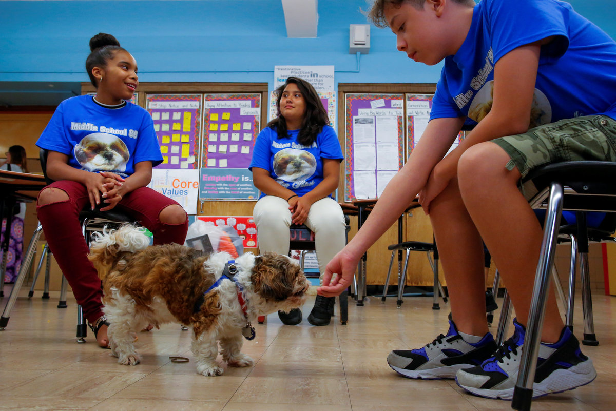 Petey joined the MS 88 community last December as one of the first participants in the Comfort Dog program, which is expanding to 30 more New York schools this fall after a pilot of just seven last year.