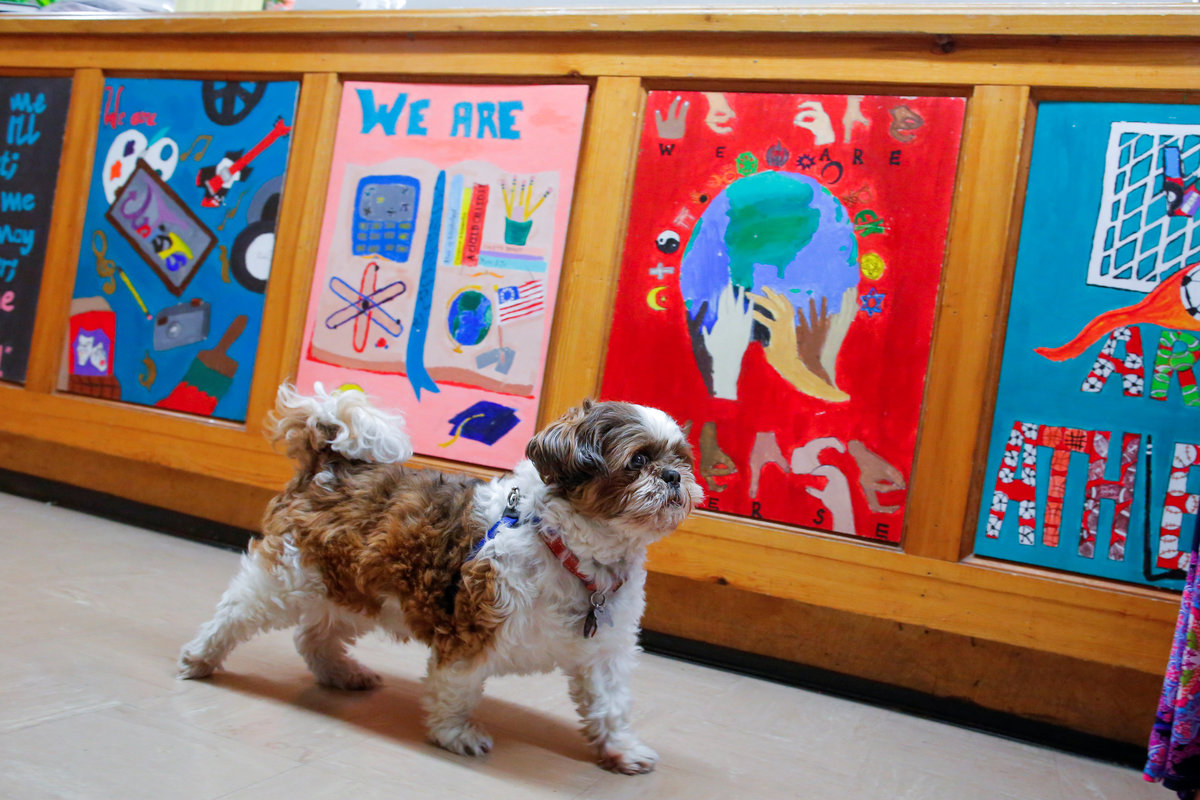 The rescued Shih Tzu mix is the darling of some 1,400 students who call out his name and lean over to pet him as he walks the corridors.