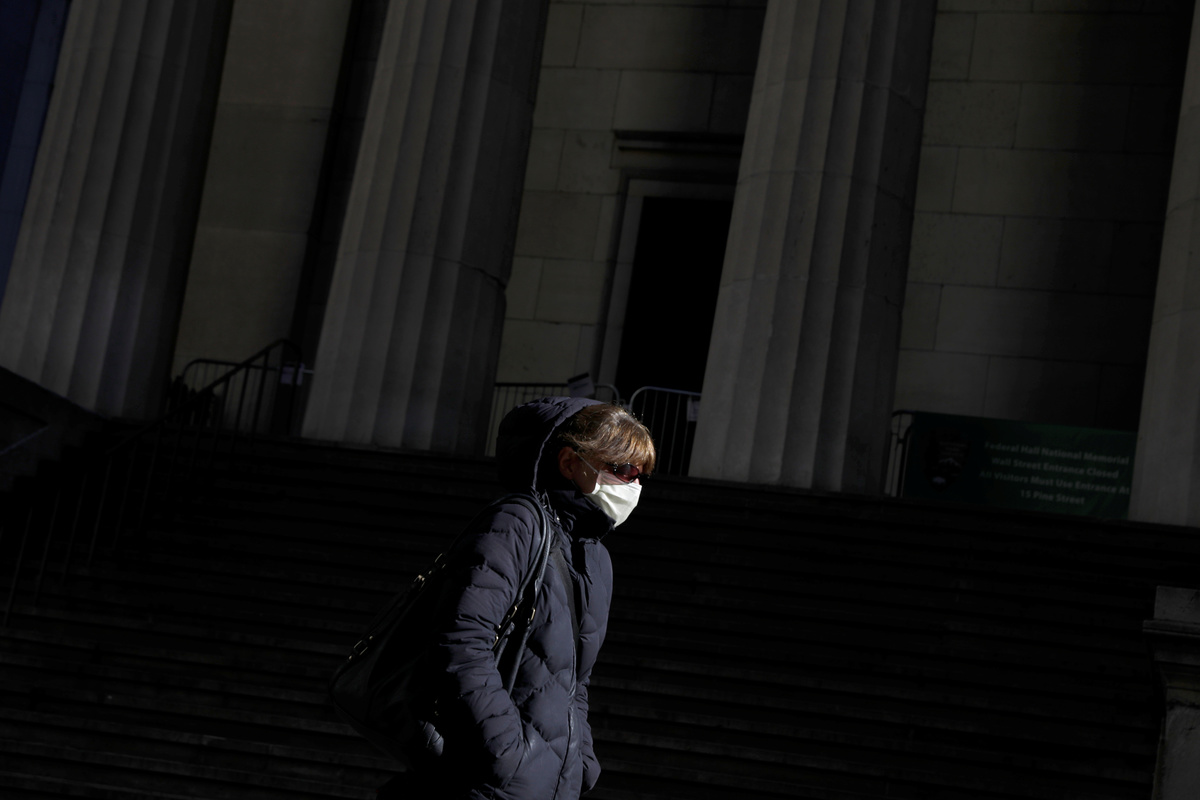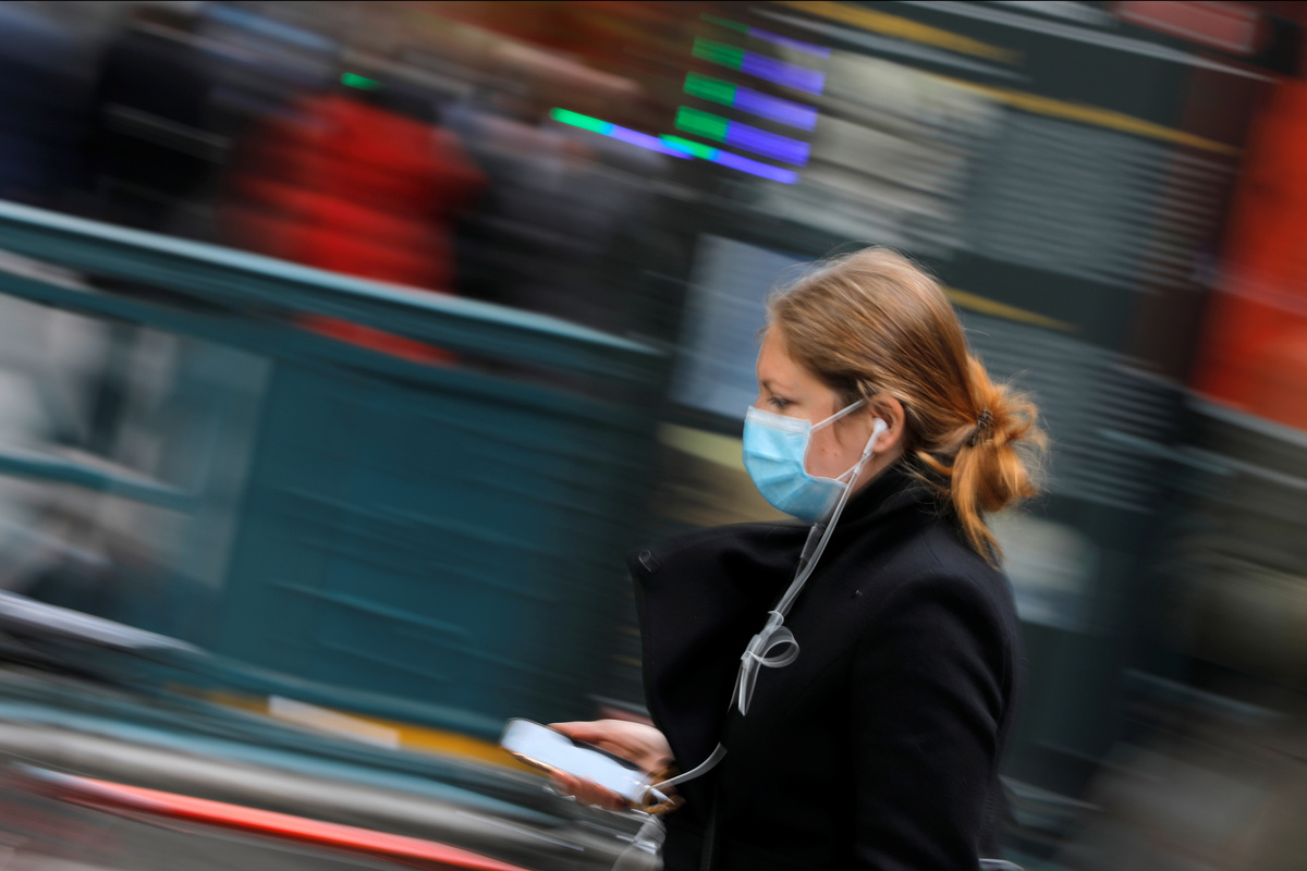 A woman in a face mask walks in the downtown area of Manhattan, New York City, after further cases of coronavirus were confirmed in New York, U.S., March 5, 2020. REUTERS/Andrew Kelly