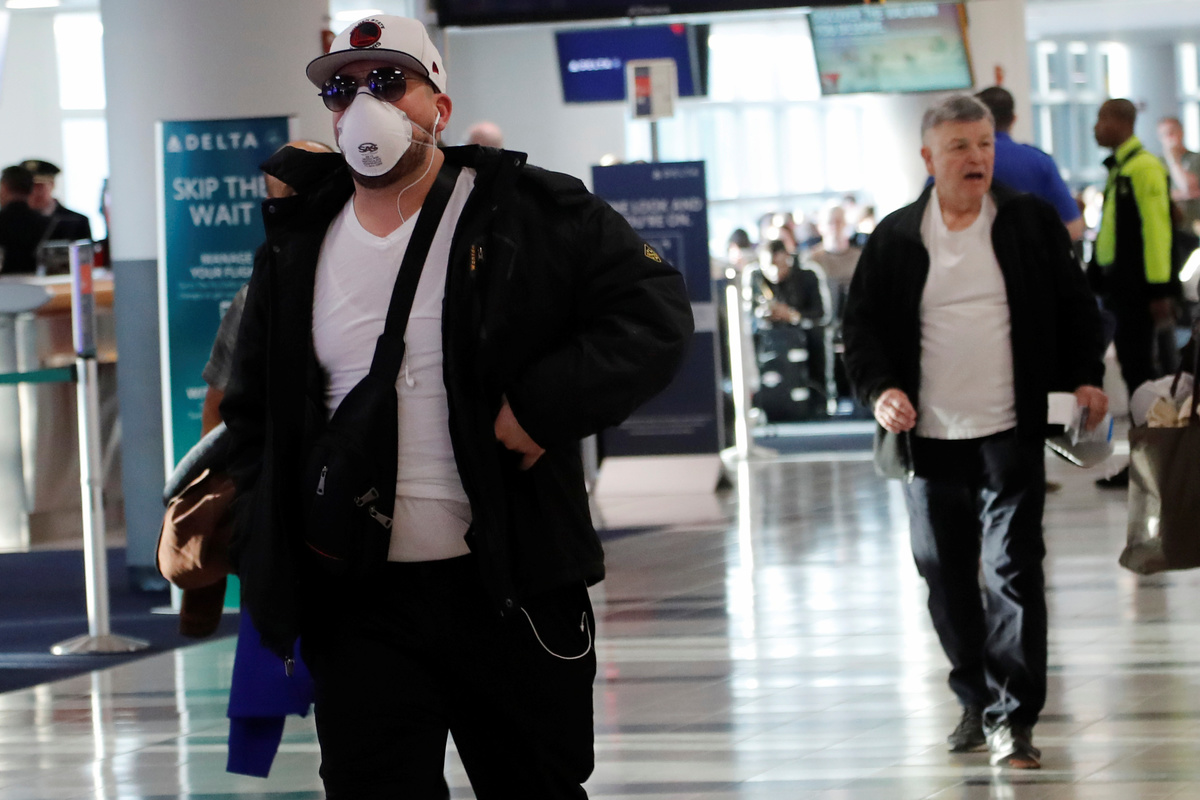 A woman walks with a face mask, after further cases of coronavirus were confirmed in New York, at JFK International Airport in New York, U.S., March 5, 2020. REUTERS/Shannon Stapleton